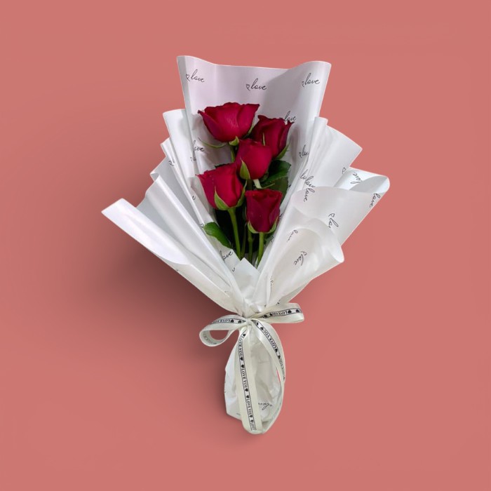 باقة تجمع بين 5 ورود جوري حمراء نابضة بالمشاعر وأوراق الروسكس الأخضر الطبيعي التي تضيف لمسة من التوازن والنعومة. تنسيق بسيط وأنيق يناسب كل المناسبات الرومانسية أو كل لحظة تود أن تعبّر فيها عن اهتمامك بلمسة راقية.