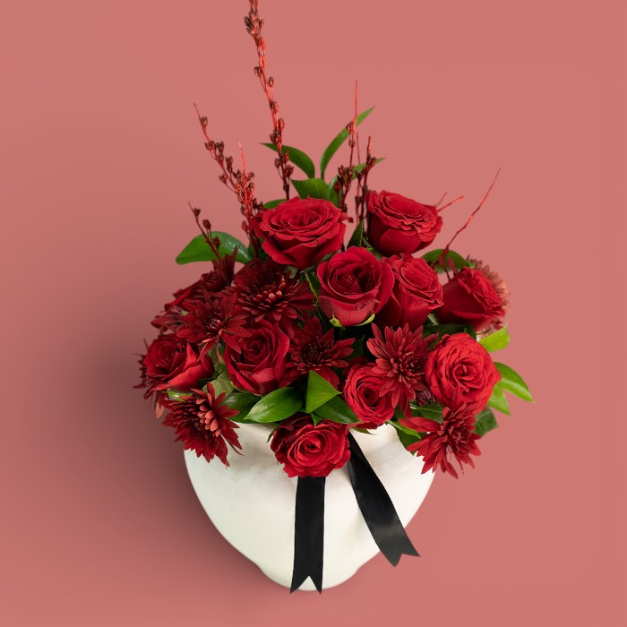 فخارة فاخرة بتصميم أنيق، تحتوي على 10 ورود جوري حمراء طبيعية مرتبة بعناية لتعكس جمال الحب والرومانسية، مع زهور الكريز الحمراء التي تضيف لمسة ناعمة وحيوية. تنسيق راقٍ يجمع بين الفخامة والجمال الطبيعي، ليكون هدية مثالية للمناسبات الخاصة والتعبير عن المشاعر بأسلوب أننيق ولا يُنسى. 🌹✨