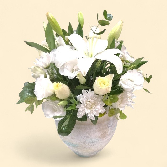 An elegant floral arrangement featuring 8 white roses symbolizing purity, 8 Louisiana roses for a touch of luxury, 6 chrysanthemums adding natural brightness, and 1 lily completing the arrangement with exceptional elegance. Perfect for gifts and special occasions.