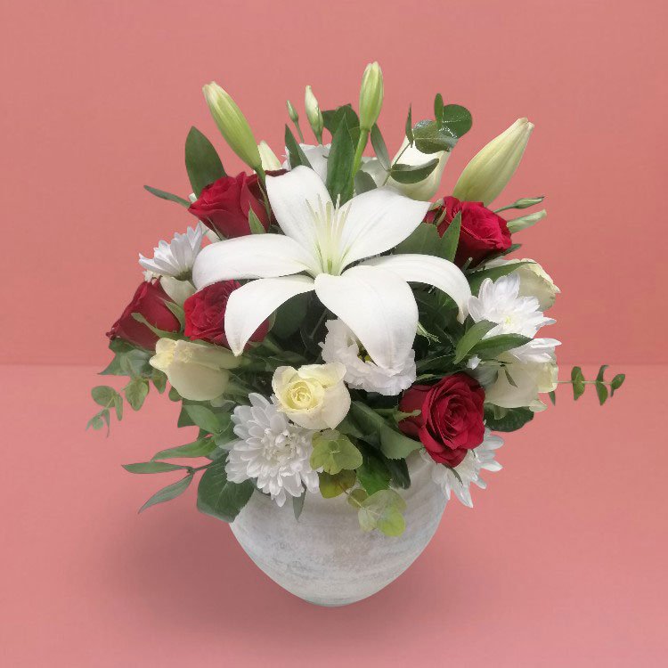 An elegant floral arrangement featuring 15 white and red roses symbolizing love and purity, 6 chrysanthemums adding a touch of natural brightness, and 1 lily completing the arrangement with sophistication. Perfect for gifting on special occasions.
